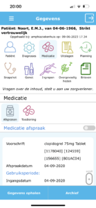 - De arts ziet dan onderstaand scherm met jouw gegevens, bijvoorbeeld de gebruikte medicatie [uiteraard zijn hier fictieve gegevens gebruikt van een testpatiënt].